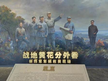 进入纪念馆正门,一副“战地黄花分外香—新四军军部在黄花塘”的油画展示了先驱们曾经战斗场景,警示我们幸福的生活来之不易,只有跟党走、听党指挥,才能实现幸福生活。