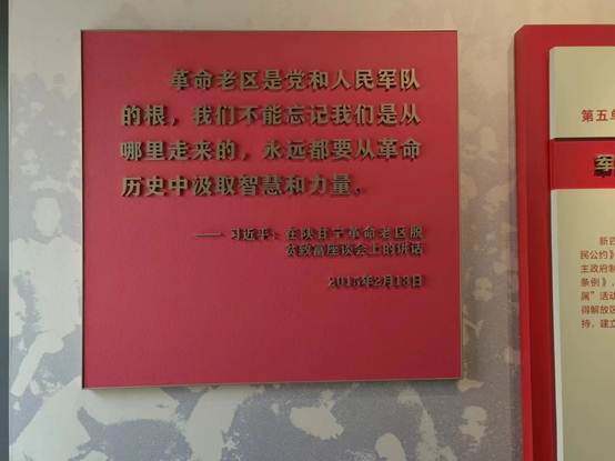 在纪念馆的出口处,一段习近平总书记的“革命老区是党和人民军队的根,我们不能忘记我们是从哪里走来的,永远都要从革命历史中汲取指挥和力量”的语录提醒我们继承和发扬党的优秀作风和光荣传统,从历史中凝聚不断前行的智慧和力量。