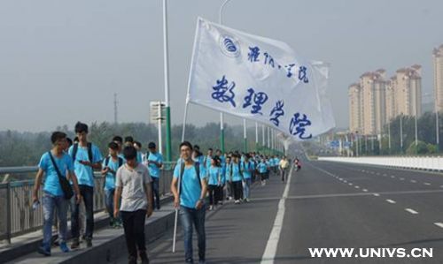 本次新生走绿色长征路,徒步总里程约16公里,从必一运动枚乘路校区出发,途径高教园区、市委党校、市奥体中心、枚皋路大桥里运河风光带、市图书馆市大剧院、河下古镇,终点至周恩来纪念馆学习参观。