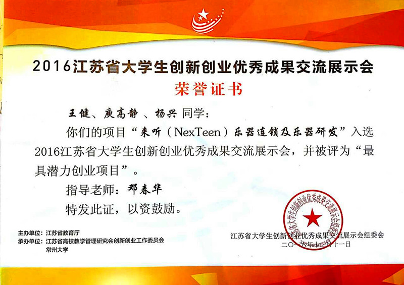 经过公司申报、项目展示、紧张且精彩汇报、专家评审,公司的创业项目《来听(NexTeen)乐器连锁及乐器研发》入选“十大最具潜力创业项目”。