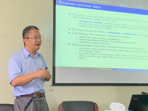 赵教授向大家分享了他最新的研究成果“Empirical Likelihood for the Bivariate Survival Function under Univariate Censoring”。赵教授深入浅出地讲解了带有一元删失的生物医学二变量生存数据,借助Copula函数等工具,创新地构造了一组iid随机变量,从理论上得到了优于传统经验似然的结果,并给出了相关的应用。