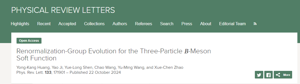 10月22日,公司必一运动教师王超联合南开大学教授王玉明、中国海洋大学教授沈月龙在国际物理学期刊《Physical Review Letters》发表研究论文《Renormalization-Group Evolution for the Three-Particle B-Meson Soft Function》。此次为王超继2023年9月之后再次在该期刊发表论文。